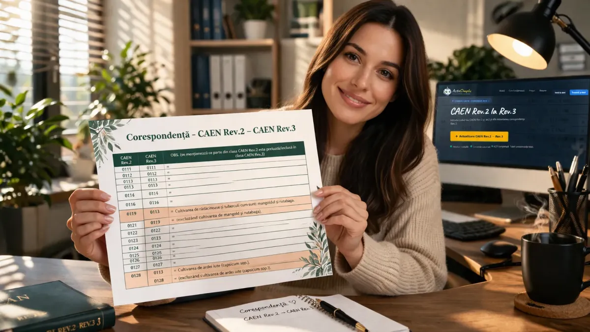 Actualizează Codurile CAEN la Rev 3 ușor, rapid și 100% online. Gata în câteva zile, fără drumuri și formulare. ActeSimplu - Pentru antreprenorii care vor lucruri bine făcute.